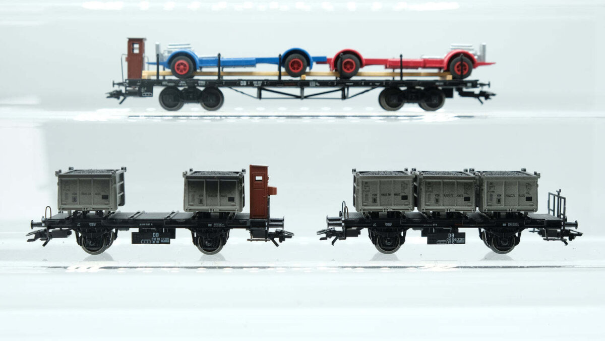 ANGEBOT Märklin H0 Konvolut Containertragewagen“ Von Haus zu Haus“; Containertragewagen mit BrHs „Von Haus zu Haus“; Rungenwagen mit LKW-Fahrgestellen; Db (17008104)