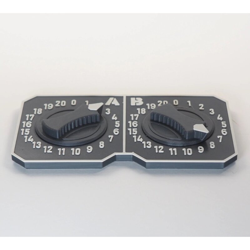 A double tabletop point counter or point tracker for counting from 0 to 20 for two players (A and B). Suitable for counting Command Points or similar for tabletop games like Warhammer 40K.