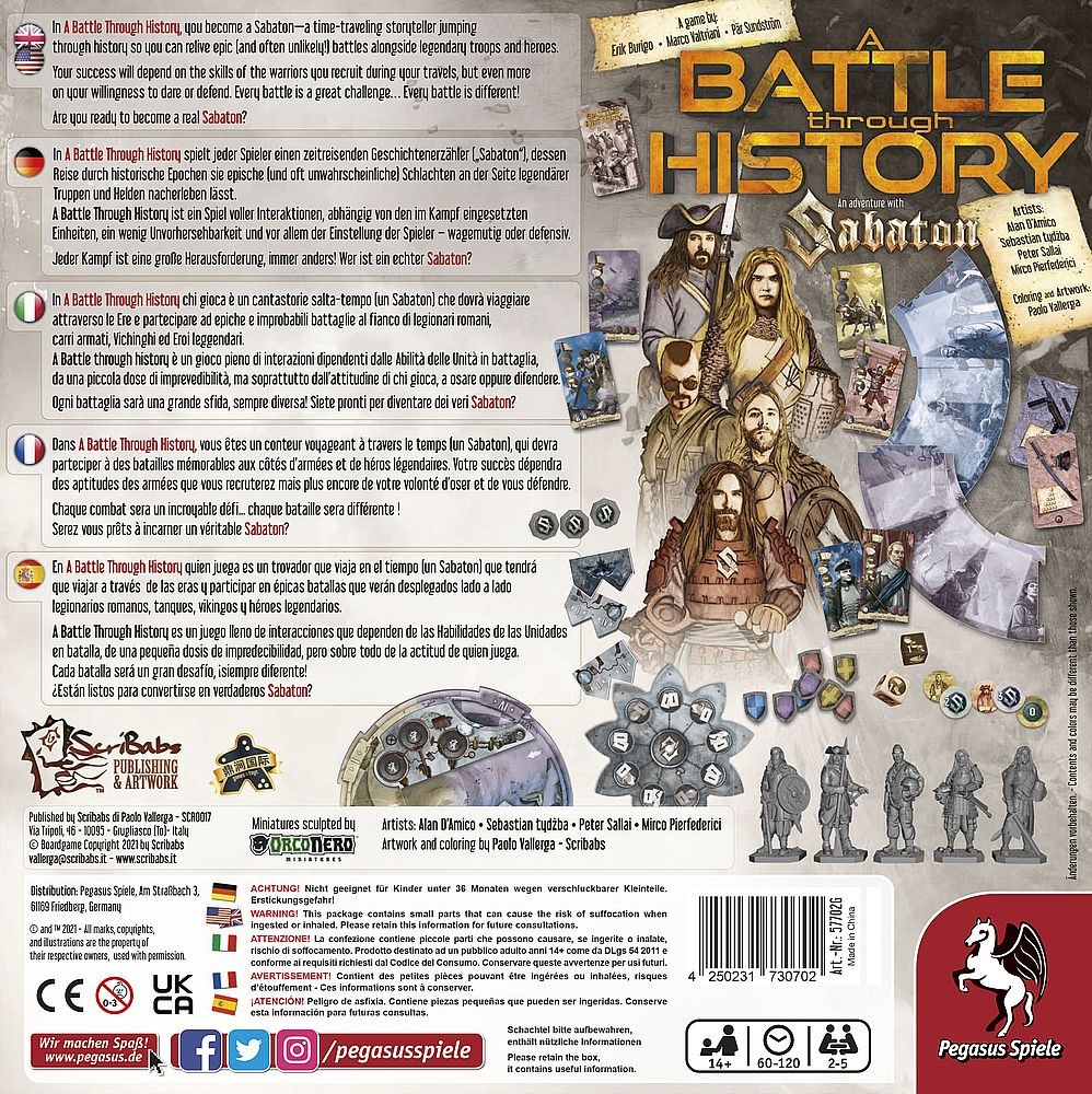 In A Battle Through Historyspielt jeder von euch einen zeitreisenden Geschichtenerzähler („Sabaton“), dessen Reise durch historische Epochen euch epische (und oft unwahrscheinliche) Kämpfe an der Seite legendärer Truppen und Helden nacherleben lässt. Jeder Spieler kann sich sowohl „der Geschichte“ stellen (durch Karten auf dem Spielbrett repräsentiert) als auch andere Spieler herausfordern, indem er Bogenschützen, Panzer, Flugzeuge, Wikinger und alle möglichen anderen Truppen einsetzt, die er bei seiner Reise durch die Epochen „erobern“ konnte. Darüber hinaus erweitern die Spieler ihr Wissen, indem sie wertvolle Relikte sammeln und so die Punkte erhalten, die zum Spielsieg nötig sind.