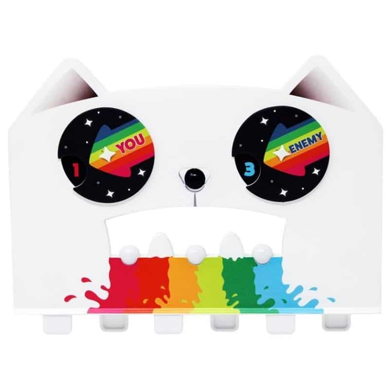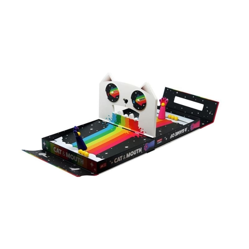 A Game of Cat & Mouth ist ein rasantes und kompetitives 2-Spieler-Actionspiel von den Machern von Exploding Kittens. Die Spieler versuchen, die bunten Kugeln so schnell wie möglich durch das Maul der Katze auf die Seite des Gegners zu schießen. Es ist wie Flipperspielen, aber mit einer Katzenkralle!