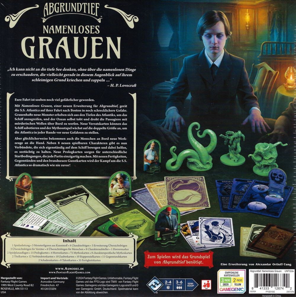 Mit Namenloses Grauen, der Erweiterung für Abgrundtief, gerät die S.S. Atlantica auf ihrer Fahrt nach Boston in noch schrecklichere Gefahr. Grauenhafte neue Monster erheben sich aus den Tiefen des Atlantiks, um das Schiff anzugreifen, und der Ozean selbst tobt und droht die Passagiere mit mörderischen Wellen über Bord zu werfen.