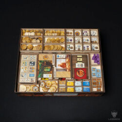 Das Insert kommt mit einer Vielzahl von Trays: zwei Schalen für Münzen und vier Geländeplättchenhalter sorgen dafür, dass alle Spieler ihre Ressourcen während des Spiels leicht erreichen können. Die Trays für die Solo-Modus-Komponenten im unteren Layer, sowie diverse Trays, Karten- und Plättchenhalter sorgen für eine nie dagewesene Organisation und Zugänglichkeit.