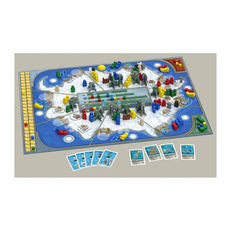 Dein Ziel ist es, Forschungszentren in der Antarktis zu errichten und Ressourcen abzubauen… für rein wissenschaftliche Zwecke, versteht sich. Die Sonne dreht sich gegen den Uhrzeigersinn um die Antarktis, wodurch immer ein Schiff eisfrei wird und dessen Besitzer einen Spielzug machen kann. Am Ende des Spiels bekommst Du Siegpunkte für Mehrheiten in Gebieten, Forschung, Prestigebauten und Ressourcen. Wird Dein Team die meisten haben… den größten Beitrag zur Rettung der Menschheit beigetragen haben?