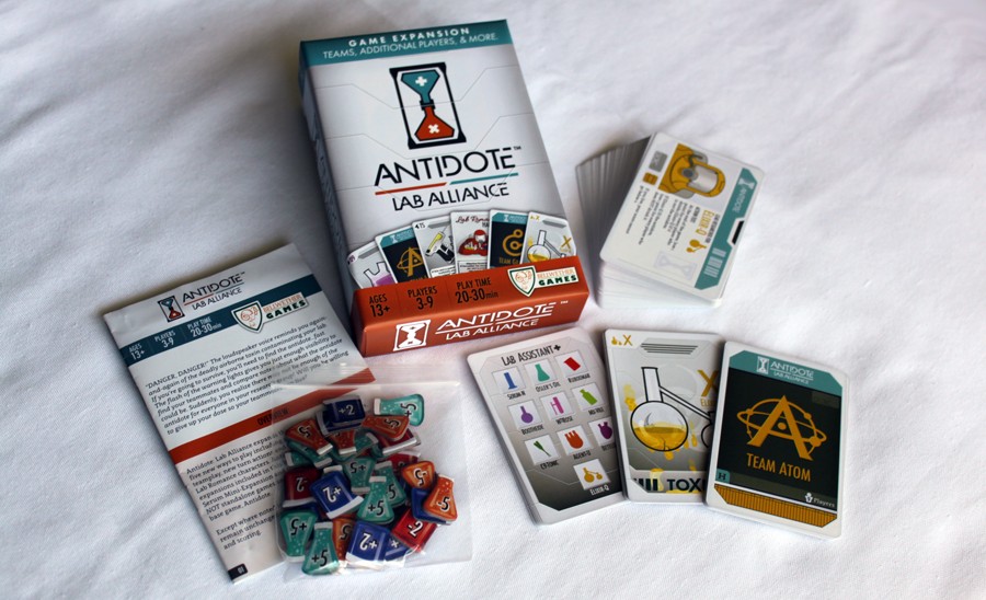 Antidote: Lab Allianceintroduces five new ways to play, including support for up to nine players, team play, new turn actions and special cards, and sinister new Lab Romance characters!