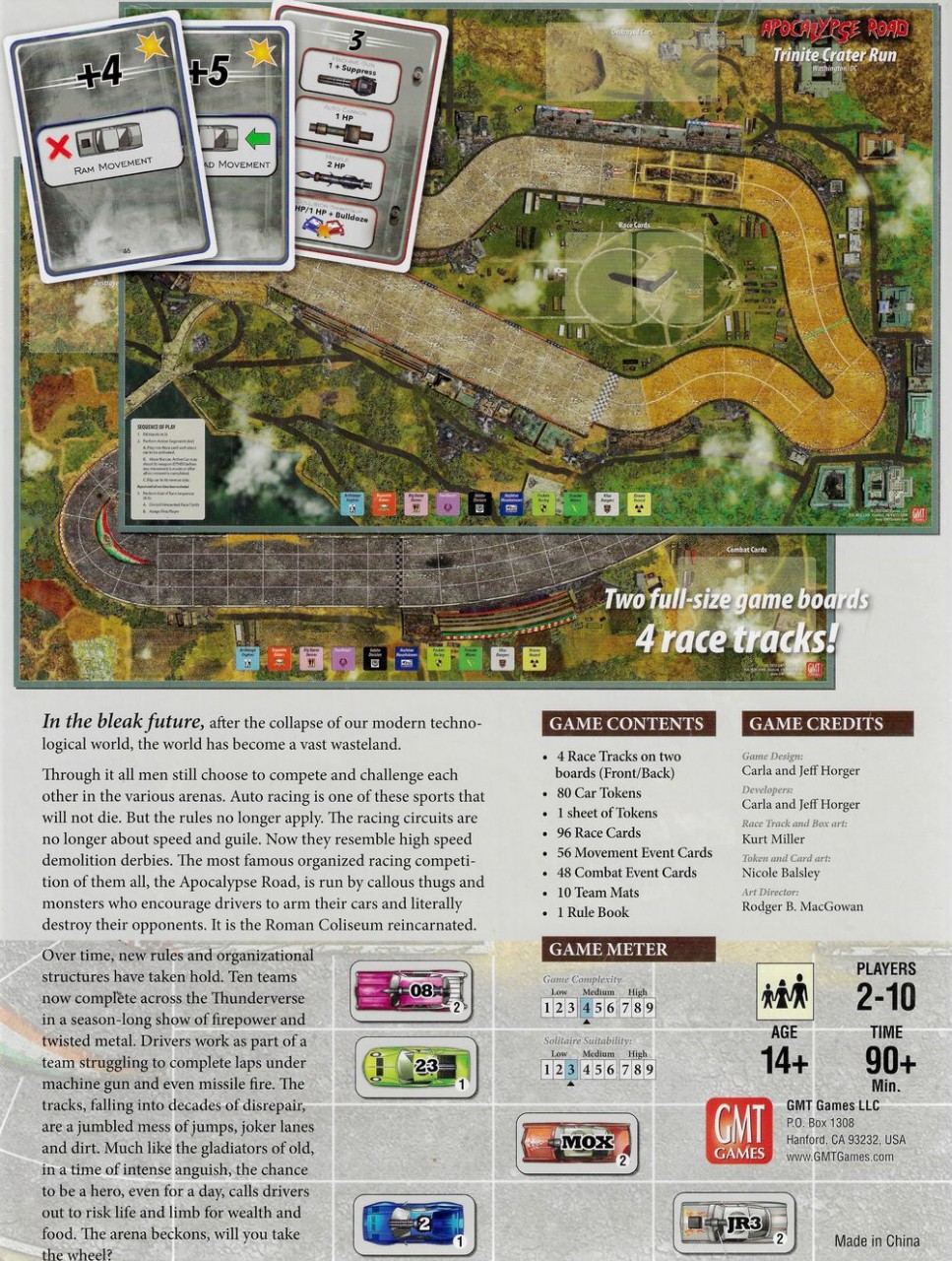 Apocalypse Roadis a race game using the Thunder Alley/Grand Prixengine. Players attempt to score points by crossing the finish line (somewhat like roller derby) and by eliminating opposing cars. The first team to 15 points wins the event and gets a double portion of foodstuffs as a reward.