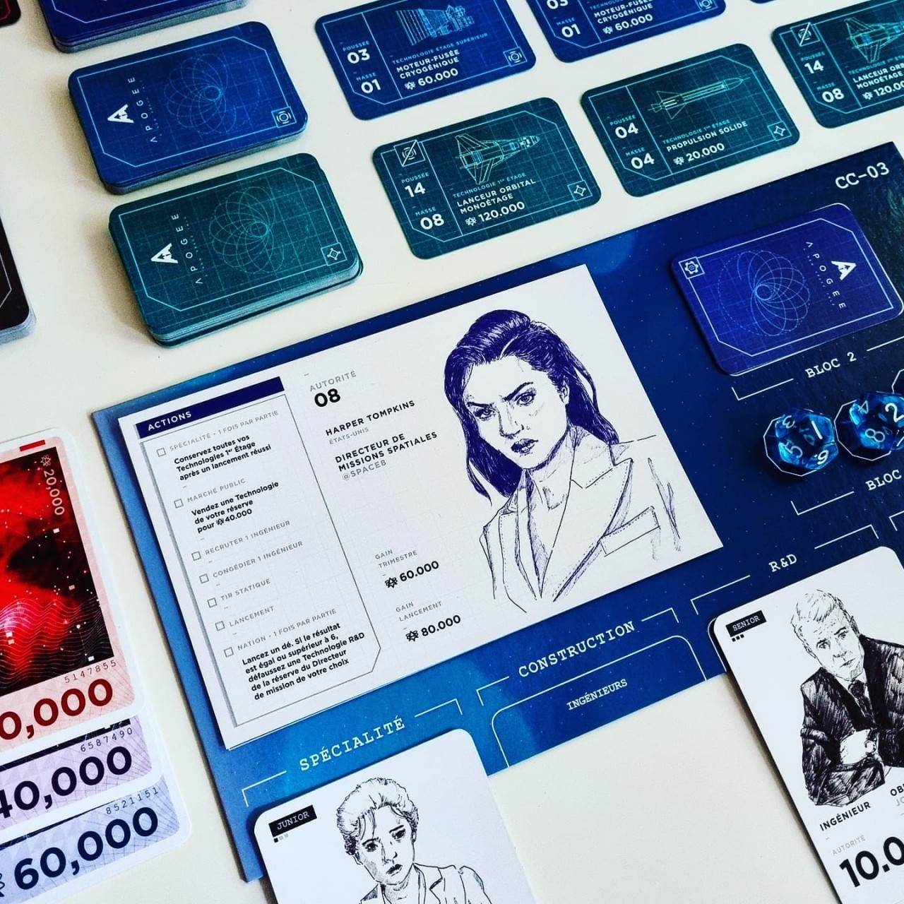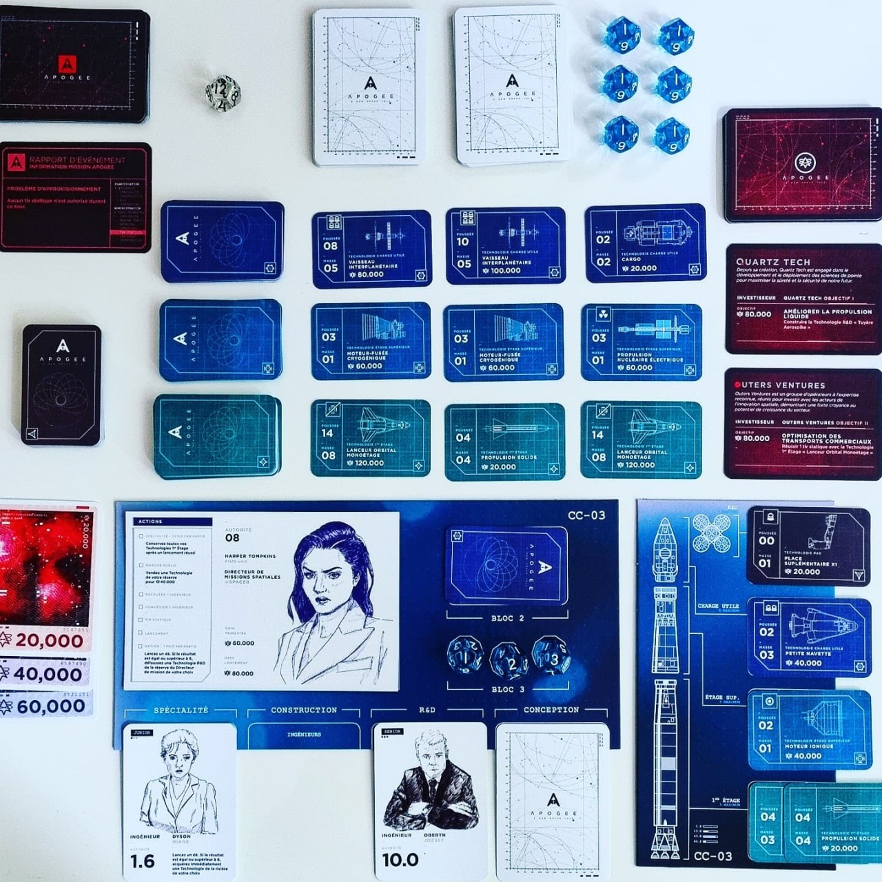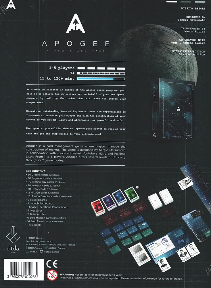 Apogeeis a card management game where players manage the construction of rockets. The game is designed by Sergio Matsumoto in collaboration with space enthusiast Youtubers Hugo and Maxime Lisoir. From 1 to 5 players, Apogee offers several level of difficulty through its 2 game modes.