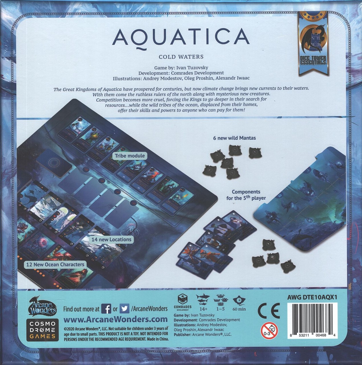 The expansionAquatica: Cold Watersconsists of several modules. It includes all necessary components for the fifth player, which can be used with the basic game, but also brings new type of locations, new cards of Ocean’s creatures, and alternative mechanic, replacing the goal-track in the basic game.
