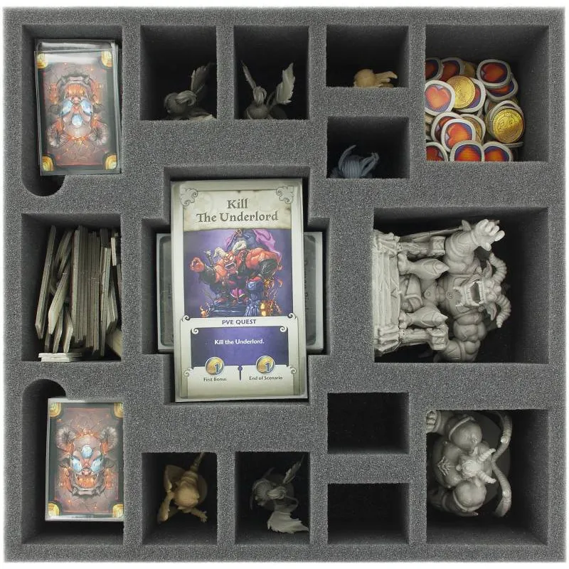 Schaumstoffset speziell für die Arcadia Quest – Inferno Grundspielbox. Es passen alle Figuren, Karten in Hüllen und Token aus der original Grundbox in die Einlagen. Die Spielplanteile kommen hierbei auf oder unter den Schaumstoff. Für alle, die die Spielplanteile auch in Schaumstoff verstauen möchten empfehlen wir folgende Einlage aus unserem Shop (104-0202).
