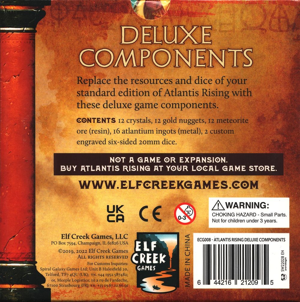Enhance the look and feel of your copy of Atlantis Rising with these jaw-dropping component upgrades. The upgrade replaces the acrylic gems with uniquely shaped resin and metal resources and includes new wooden pieces and thematic, engraved dice. These deluxe components are a wonder to behold!