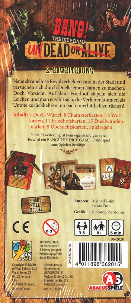 Produkteigenschaften Zu den Produkteigenschaften mehr Menü schließen Produktinformationen „BANG! The Dice Game – Undead or Alive (DE)“