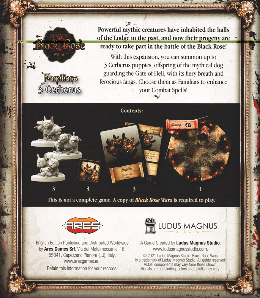 This expansion introduces Cerberus Familiars: using this set you will be able to summon up to 3 puppies of Cerberus (Polpetta, Muso, and Argo), the offspring of the mythical dog that guards, with its fiery breath and its ferocious fangs, the Gate to Hell.