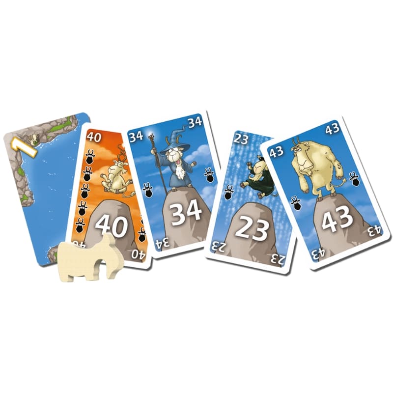 In diesem originellen Kampfspiel versuchen Sie, so viele Ziegen wie möglich zu sammeln, ohne das Limit zu überschreiten. Zu Beginn werden Ihnen 8 Karten ausgeteilt. Jeder Spieler spielt immer 1 Karte, einen Stich, offen auf den Tisch. Der Spieler, der die Karte mit dem niedrigsten Wert gespielt hat, zieht eine Hügelkarte und legt sie auf den Tisch, wobei er einen der beiden Werte darauf wählt. Der Spieler, der die Karte mit dem höchsten Wert gespielt hat, gewinnt den Stich und beginnt mit dem nächsten Stich.