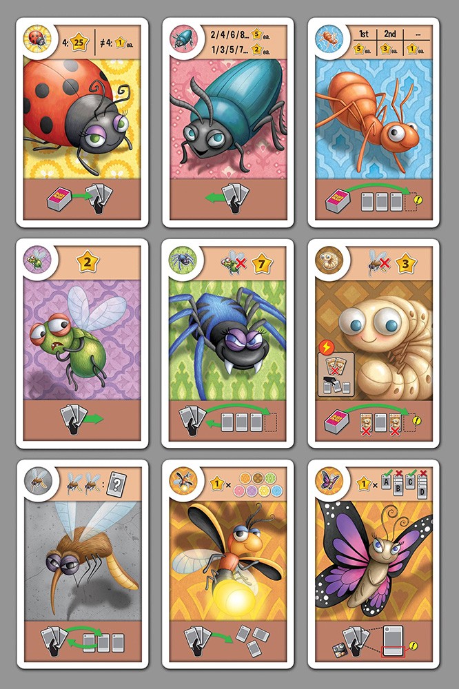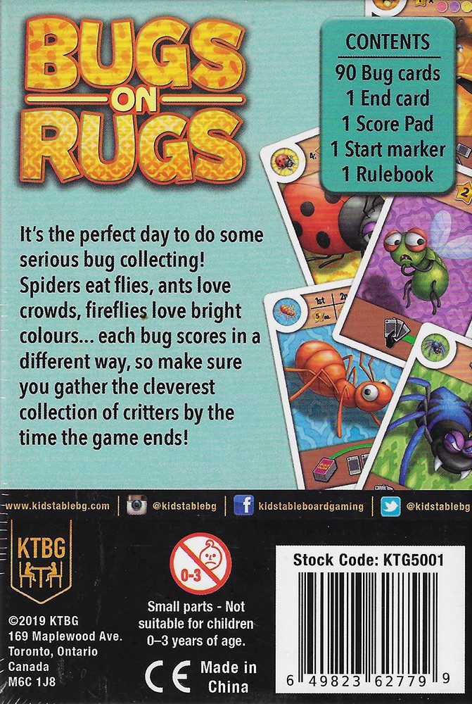 In Bugs on Rugs, players take turns drafting bug cards to their hand to make sets. At the end of the game players reveal their bug collections. The player who has made the most valuable hand of creepy crawlers WINS!