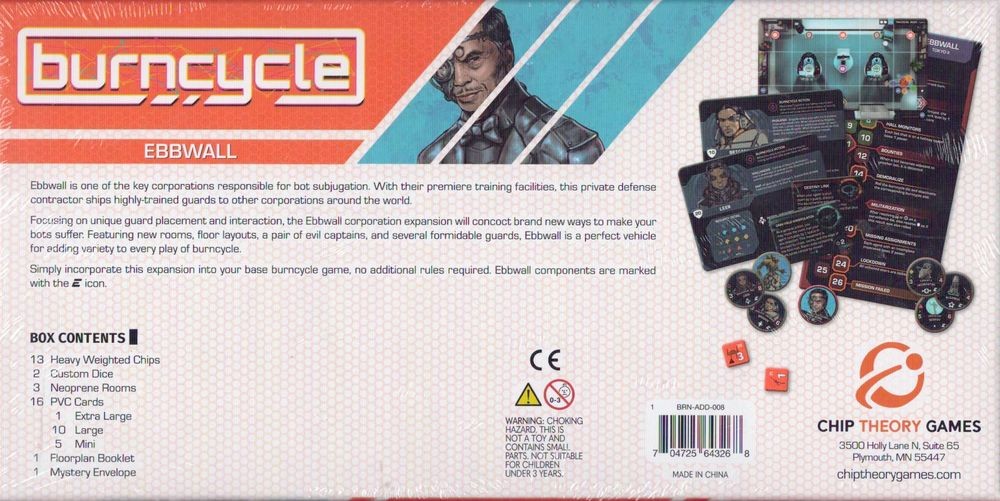 Focusing on unique guard placement and interaction, theEbbwall corporation expansionwill concoct brand new ways to make your bots suffer. Featuring new rooms, floor layouts, a pair of evil captains, and several formidable guards, Ebbwall is a perfect vehicle for adding variety to every play of burncycle. Simply incorporate this expansion into your base burncycle game, no additional rules required.