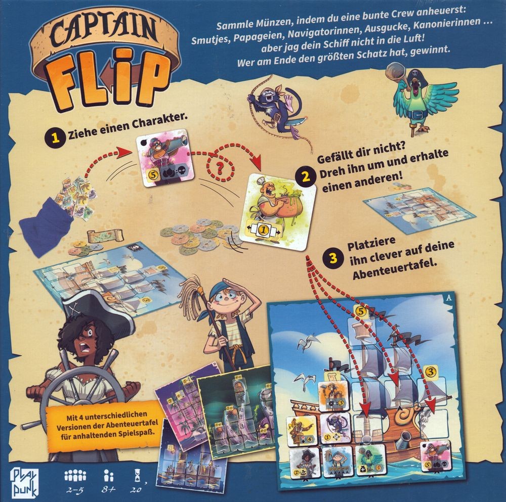 Ihr seid nicht zufrieden mit Smutjes, Papageien, Navigatorinnen, Augucken oder Kanoniererinnen? Dann könnt ihr durch den innovativen Flip-Mechanismus einmalig entscheiden, das Plättchen umzudrehen und einen anderen Charakter zu erhalten. Durch spannende Sofort-Effekte und Synergien könnt ihr das Beste aus eurer Crew herausholen – oder euer Schiff in die Luft jagen. Wer am Ende den größten Schatz hat, gewinnt!