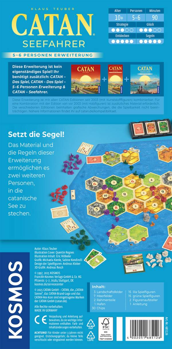 Neben CATAN – Das Spiel, werden die Erweiterung von CATAN – Das Spiel für fünf bis sechs Spielerinnen und Spieler sowie das Material der entsprechenden Szenarien aus der CATAN – Erweiterung „Seefahrer“ benötigt. Auf in neue Abenteuer in der CATAN-Welt von Bestseller-Spieleautor Klaus Teuber!