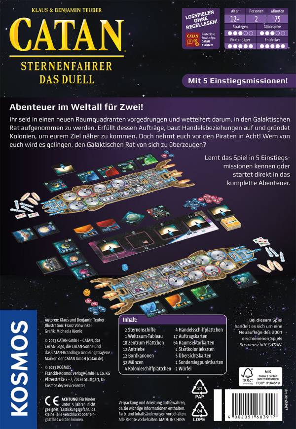 Auf Entdeckungsreise durchs All! Mit ihren Raumschiffen reisen zwei Spielerinnen oder Spieler durch die Weiten des Universums. Auch auf fernen Planeten lautet ihre Mission: handeln und bauen. Sobald ihre Raumschiffe startklar sind, beginnt die Reise in die Tiefen des Weltraums auf der Suche nach Handelsplaneten und neuen Stützpunkten. Allerdings sind auch Piraten unterwegs, die von ihrem Reichtum profitieren wollen. Wer findet die richtige Strategie, erfüllt die unterschiedlichen Missionen und überwindet die Piraten? Der Einstieg in das Spiel gelingt leicht mit fünf Lernmissionen. Durch die dynamischen Kartenstapel verläuft jedes Spiel anders und bietet neue Herausforderungen! Die umfangreich überarbeitete Neuauflage des beliebten Abenteuers CATAN – Sternenschiff für zwei Personen ab 12 Jahren.