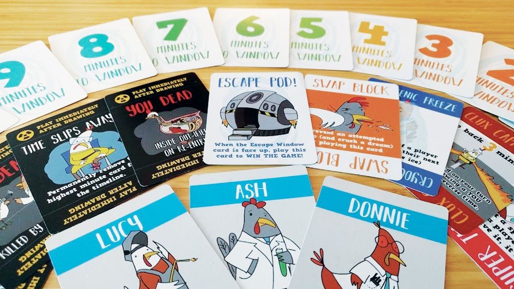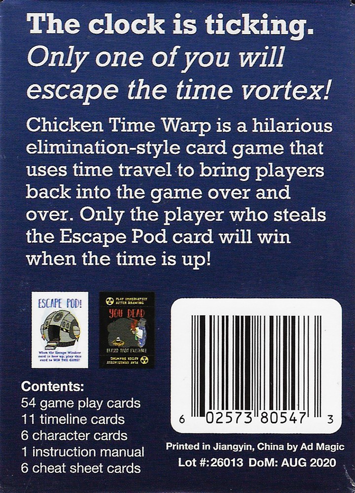 Chicken Time Warpis a time travel card game for 3-6 players that takes under 30 minutes to play. Gameplay centers around a set of cards called the Timeline that count down minutes until the escape window is open and the escape pod can be used by a single player to escape the vortex (and survive!). The object of the game is to acquire the Escape Pod card and play it when the escape window is open.