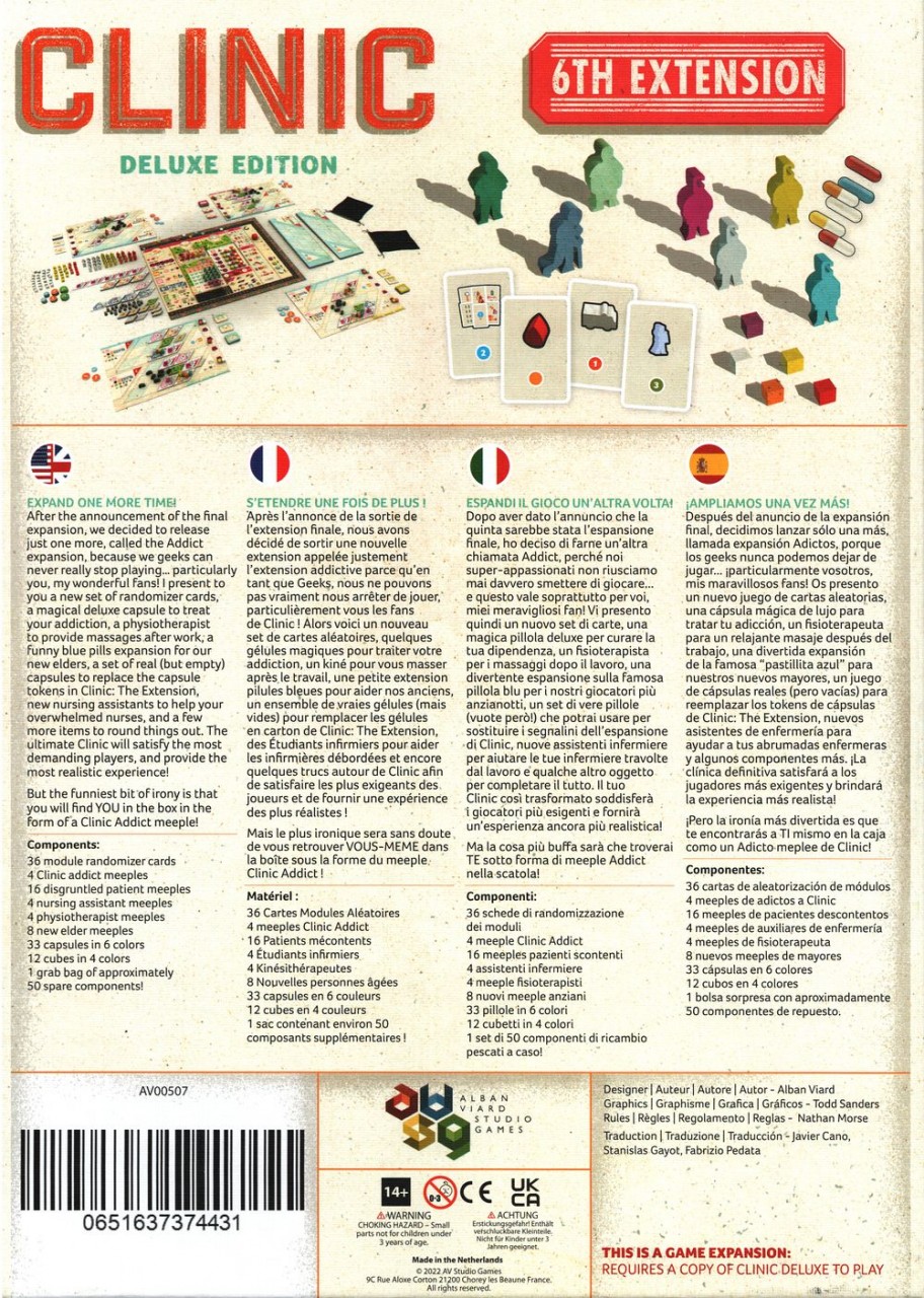 After the announcement of the final expansion, we decided to release just one more, called the addict expansion, because we geeks can never really stop playing – particular you, my wonderful fans! I present to you a new set of randomizer cards, a magical deluxe capsule to treat your addiction, a physiotherapist to provide massages after work, a funny Viagra expansion for our new elders, a set of real (but empty) capsules to replace the capsule tokens in Clinic: The Extension, new nursing assistants to help your overwhelmed nurses, and a few more items to round things out. The ultimate Clinic will satisfy the most demanding players, and provide the most realistic experience.