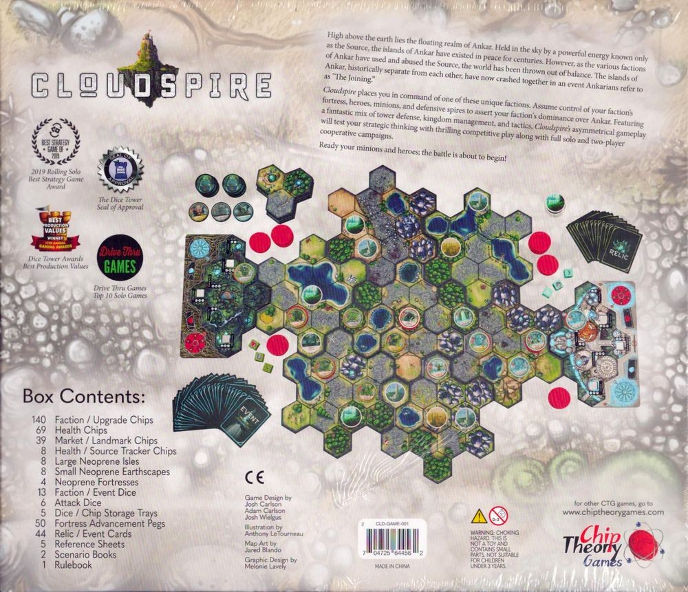 Cloudspire features the industry-best components Chip Theory is known for, including one of the first ever modular neoprene game boards, our heavy unit chips, HD heat transferred dice, and PVC cards and reference sheets that will hold up to heavy play and spills without ever seeing the inside of a card sleeve.