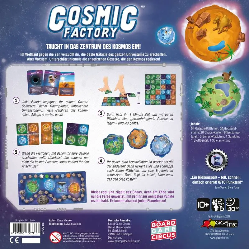 In einem Wettlauf gegen die Zeit versucht ihr, die beeindruckendste Galaxie des ganzen Universums zu erschaffen. Dazu müsst ihr eure Planeten in verschiedenen Zonen anordnen und zugleich versuchen, die längstmögliche Asteroidenbahn zu erhalten. Doch Vorsicht! Unterschätzt niemals die unbeständigen Gesetze, die den Kosmos regieren, denn Chaos kann in jeder Runde für neue Überraschungen sorgen! Behaltet bei Cosmic Factory einen kühlen Kopf und immer die richtige Balance, denn zum Schluss zählt nur eure schwächste Zone.