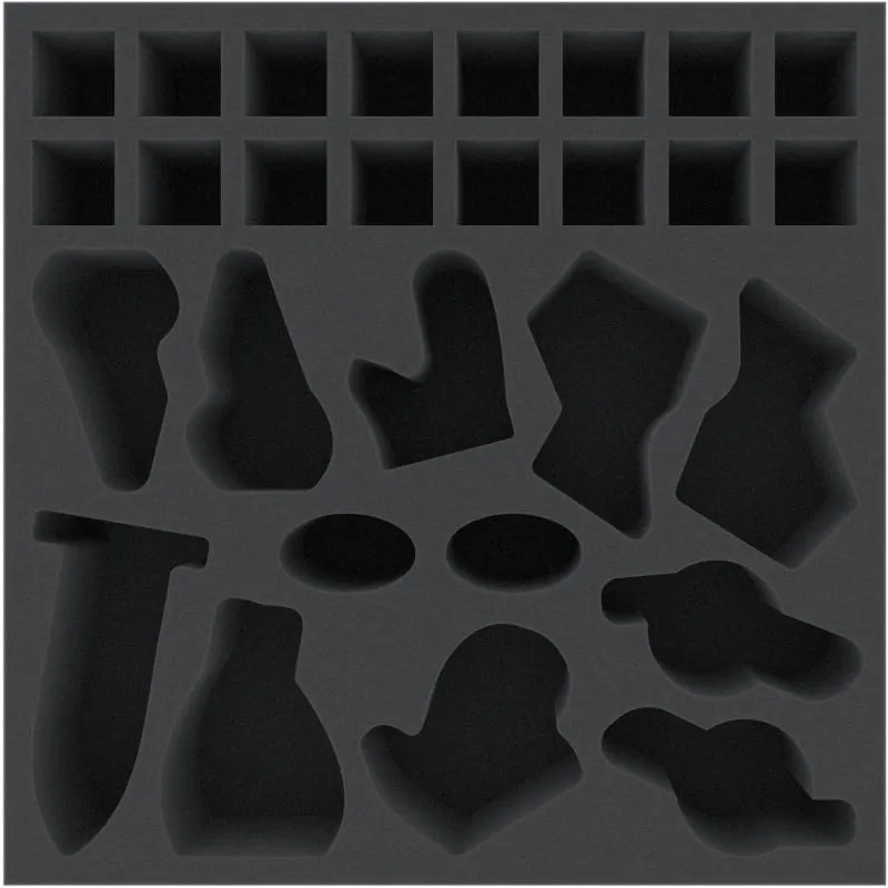 Jede Figur bekommt ein eigenes Fach und ist so komplett von Schaumstoff umgeben. Nichts rutscht umher und auch unterwegs bleiben die Figuren wo sie sind. Falls du deine Miniaturen bemalst, kannst du sicher sein, dass die Farben auch nach dem Transport noch unversehrt sind.
