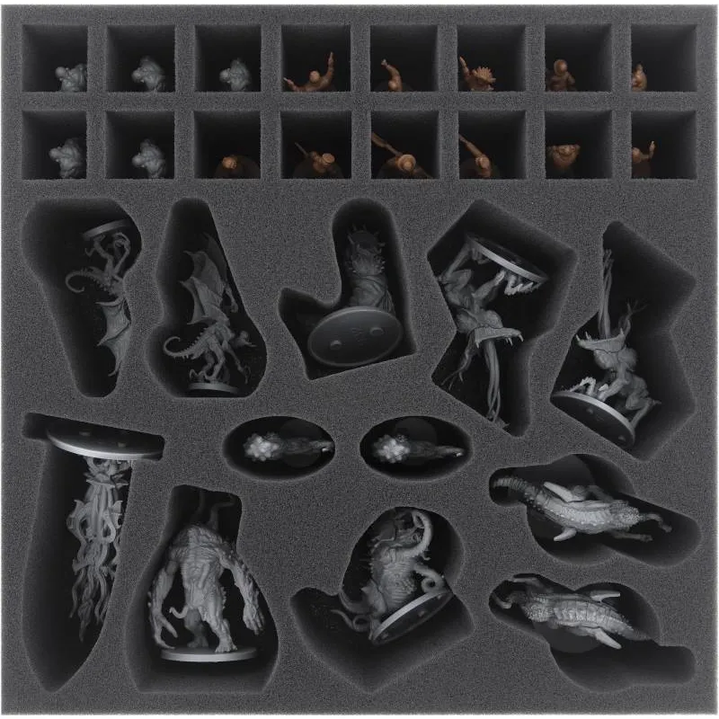 Alle Miniaturen aus der Erweiterung finden übersichtlich geordnet auf der Einlage ihren Platz. Die großen Monster liegen in maßgeschneiderten Fächern, die kleineren sind zusammen mit den Ermittlerfiguren in den rechteckigen Fächern untergebracht. Der passgenaue Zuschnitt sorgt dafür, dass die Miniaturen optimal vor Beschädigungen geschützt sind.