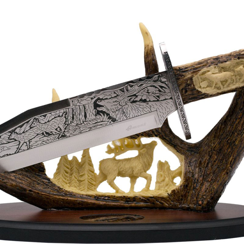 Dekomesser Hirsch– aufwendig verarbeitetes Messer inklusive dekorativem Holzständer. Die Klinge besteht aus 420er rostfreiem Edelstahl und ist mit verschiedenen Hirsch Motiven gestaltet.