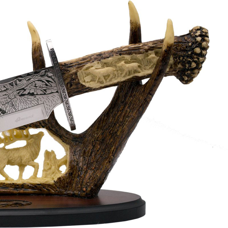 Der Holzständer sorgt dafür, dass das Messer sicher und stilvoll präsentiert werden kann, sodass es als Blickfang in deinem Wohnraum dient. Diese Art von Dekormesser eignet sich hervorragend als Geschenk oder als Ergänzung für eine Sammlung von Jagd- oder Naturmotiven.