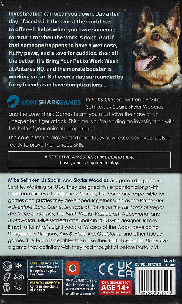 If you are looking for a modern detective simulator, this is the game for you. Agents of Antares come back! Canto Parellis, the famous handler, gets badly injured during practice. Is the wild tiger responsible for the accident or is there something else?Petty Officersis an expansion to the legendary criminal board game Detectiveby Ignacy Trzewiczek (Imperial Settlers, Robinson, Stronghold).
