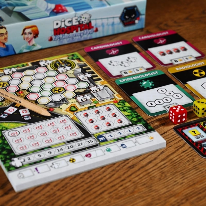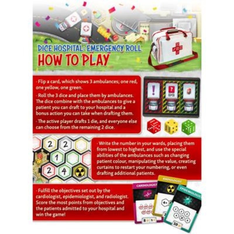 In Dice Hospital: ER – Emergency Roll versucht jeder, so viele Patienten wie möglich im Krankenhaus zu behandeln, seine Stationen zu füllen, zusätzliche Patienten aufzunehmen, zu entscheiden, wann und wo Krankenschwestern untergebracht werden, und die Anforderungen der drei Spezialisten zu erfüllen.