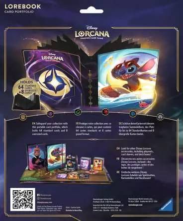 Store cards for quick reference and easy access for trading with this 10-page portfolio featuring card art of Stitch from Disney Lorcana: The First Chapter. Each portfolio can hold up to 64 standard-sized cards and 8 oversized cards.