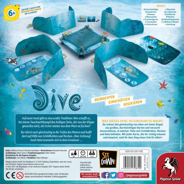 Dive enthält neben einer Solospielregel auch Regelvarianten für erfahrene Spieler oder für Familien mit Kindern ab 6 Jahren.