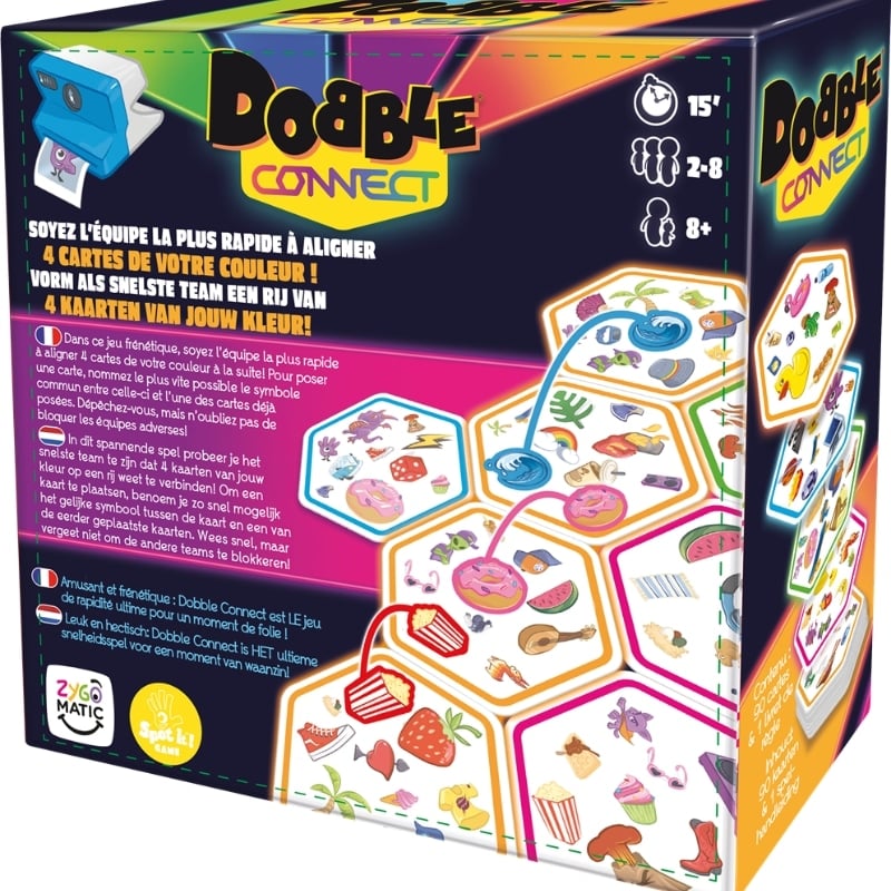 Spaßig, schnell und hektisch: Dobble Connect ist das ultimative Reflexspiel! Seien Sie das schnellste Team, indem Sie 4 Karten Ihrer Farbe hintereinander verbinden.