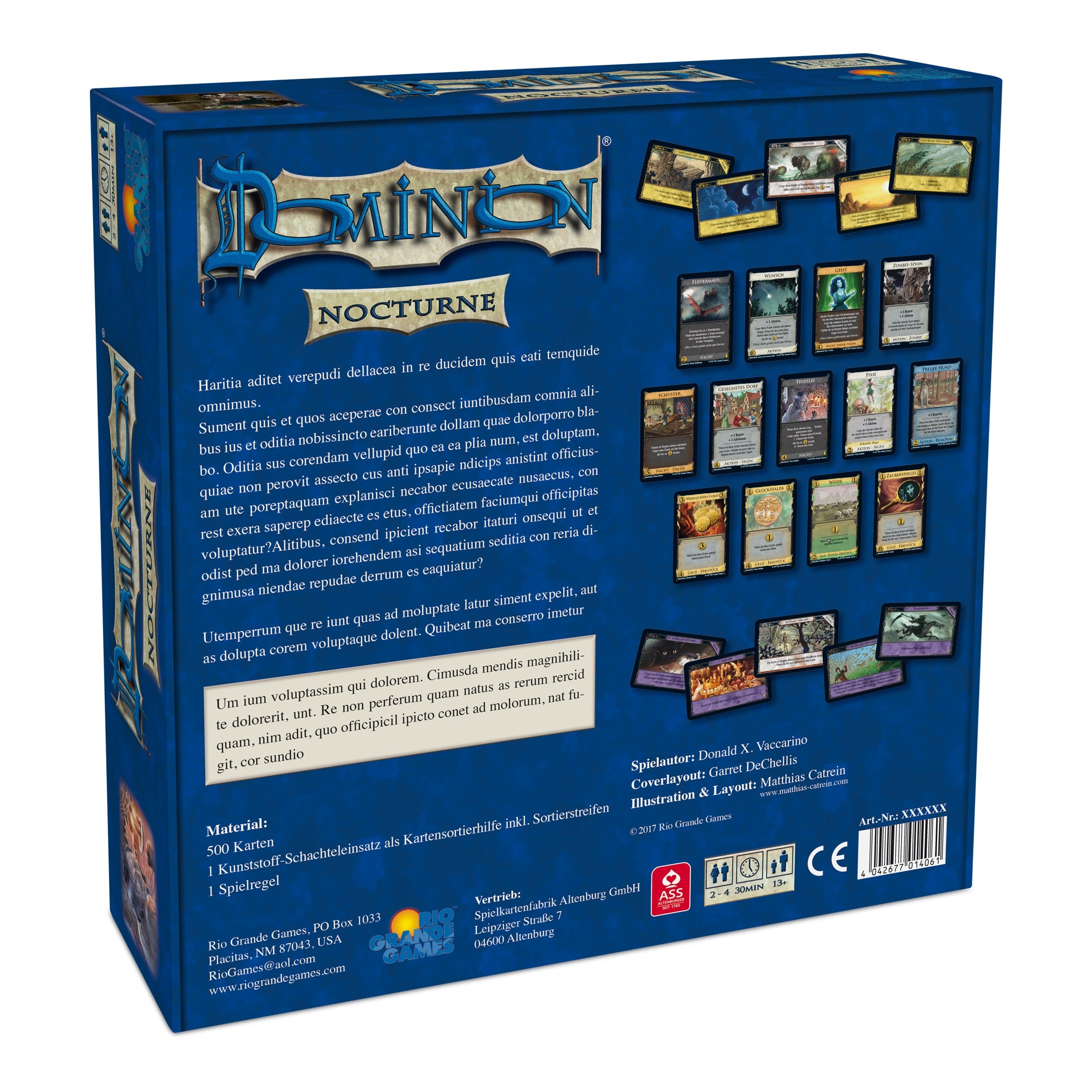 Du warst schon immer eine Nachteule, seit Kurzem überlegst du sogar, zum Vampir zu werden. Es gibt eine Menge Vorteile: du alterst nicht, du musst dich nicht mehr selbst in Spiegeln sehen; wenn jemand von dir verlangt, dass du etwas bestimmtes erledigst, kannst du dich in eine Fledermaus verwandeln und dann sagen: „Tut mir leid, ich bin eine Fledermaus.“ Es gibt aber wahrscheinlich auch ein paar Nachteile. Du musst an die Statue auf dem Dorfplatz denken, die lebendig wurde und jetzt in der Taverne als Schankmaid arbeitet. Dabei ist auch der Sockel lebendig geworden, so dass sie sich nur hüpfend fortbewegen kann. Der Dorfschmied verwandelt sich bei Vollmond in einen Wolf, bei Halbmond in einen Chihuahua. So funktioniert das nun mal. Und dennoch, wenn du die Nachtluft einatmest, fühlst du dich für alles bereit, was da kommen mag. Dominion: Nocturne, die 11. Erweiterung für Dominion, beinhaltet 500 Karten, mit 33 neuen Königreichkarten. Außerdem gibt es Nachtkarten, die nach der Kaufphase gespielt werden. Erbstücke ersetzen das Kupfergeld vom Spielbeginn. Schicksals- und Verderbenskarten bringen Segen und Verwünschungen. Und es gibt eine Reihe von weiteren Karten, die durch bestimmte Auslöser ins Spiel kommen.