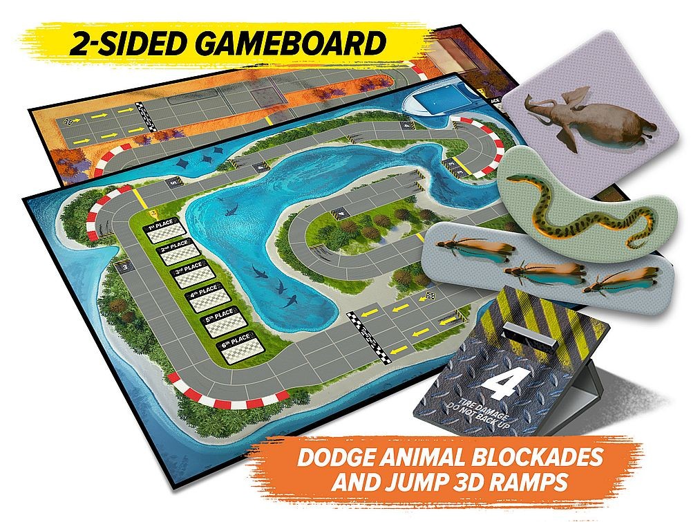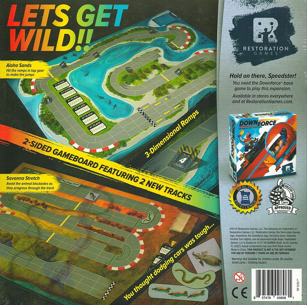 Two new tracks on a double-sided board, featuring 3D ramps and wild animals for a whole new racing experience. These new tracks offer more strategic play for seasoned Downforce players, while offering casual players a wild ride.