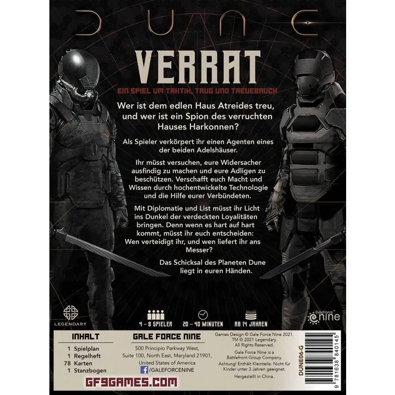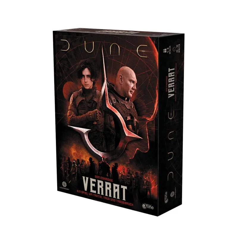 Wer ist dem edlen Haus Atreides treu, und wer ist ein Spion des verruchten Hauses Harkonnen? Im Deduktionsspiel Dune – Verrat verkörpern die Spieler Agenten eines der beiden Adelshäuser. Ihre Aufgabe ist es, ihre Widersacher ausfindig zu machen und ihre Adligen zu beschützen. Dafür nutzen sie hochentwickelte Technologien und die Hilfe von Verbündeten. Mit Diplomatie und List müssen die Spieler versuchen, Licht ins Dunkel der verdeckten Loyalitäten bringen. Denn wenn es hart auf hart kommt, liegt es an ihnen zu entscheiden: Wen verteidigen sie und wen liefern sie ans Messer? Das Schicksal des Planeten Dune liegt in ihren Händen.