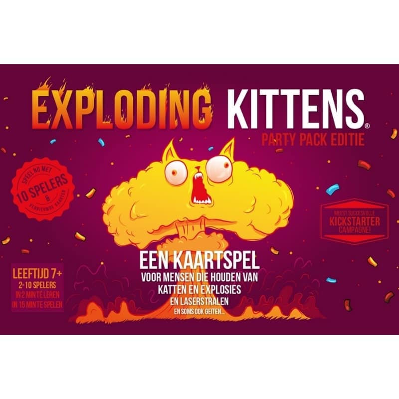 Mit dem Dutch Exploding Kittens Party Pack wird es eine Party! Spielen Sie jetzt das urkomische Kartenspiel Exploding Kittens mit nicht weniger als 120 neuen Karten, geeignet für bis zu 10 Spieler. Bei 2-3 Spielern nutzt man nur die Karten mit dem speziellen Pfotenabdruck, bei 4-7 Spielern nur die Karten ohne Pfotenabdruck, bei 8-10 Spielern nutzt man alle Karten.
