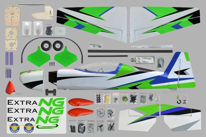 Das Modell ist in extrem leichter und verstärkter Holzbauweise gefertigt. Dabei besticht die lasergeschnittene Konstruktion durch einen enorm hohen Vorfertigungsgrad, wodurch sich der Bauaufwand nahezu auf den Einbau von Antrieb und Elektronik reduziert. Unter der großen abnehmbaren GFK-Kabinenhaube befindet sich viel Platz für den Einbau der Elektronik. Die Extra NG ist komplett fertig mit Folie bespannt.