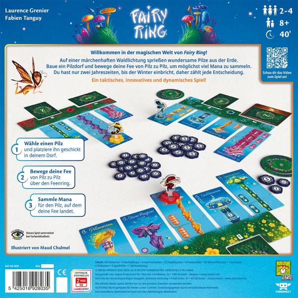Baue ein Pilzdorf in dem Familienspiel Fairy Ring und bewege deine Fee von Pilz zu Pilz entlang des Feenrings, um möglichst viel Mana zu sammeln. Du hast nur zwei Jahreszeiten, bevor der Winter einbricht. Jede deiner Entscheidungen ist daher wichtig, um das Spiel zu gewinnen.