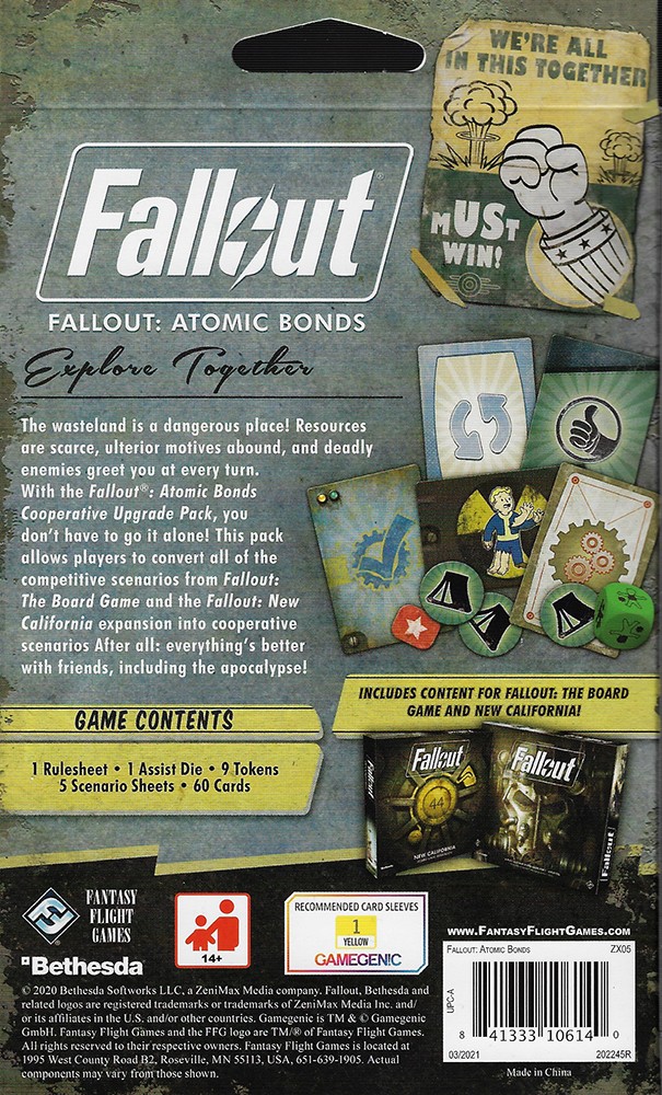 With the Atomic Bonds Cooperative Upgrade Pack for Fallout: The Board Game, the number of scenarios available to you just doubled. This upgrade pack has everything you need to play every competitive scenario from Fallout: The Board Gameand the New California expansionas a cooperative scenario. Rather than struggling against each other, Atomic Bondslets you and your friends travel the Wasteland, grab the best gear, and push your chosen faction to victory—together! Combine that with the addition of modifications, mutations, and workshop upgrades, and Atomic Bondspushes your games of Fallout to dizzy new heights.