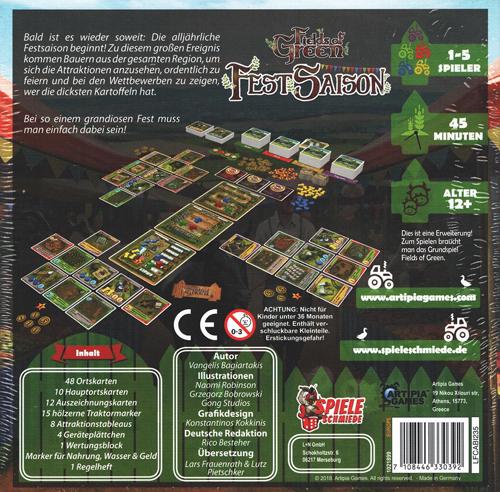 Festsaison ist eine Erweiterung für Fields of Green. Darin werden viele neue Spielelemente eingeführt, wie zum Beispiel die Attraktionen des Festes, mit denen die Spieler auf besondere Weise interagieren können. Außerdem gibt es neue Karten, Ziele und Material für einen fünften Spieler, sowie Solo-Spielregeln!