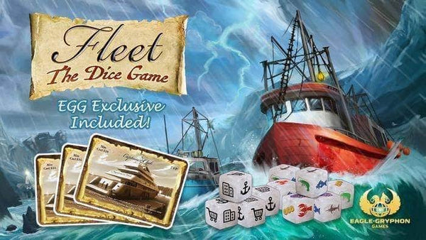 Board Game Geek Rating:6.39 Board Game Geek Avg Player Rating:7.75 Players:1 to 4 Published:2020 Content Notes: Retail Second Edition of Fleet: The Dice Game plus EGG Exclusive Dicey Waters Expansion by Eagle Gryphon Games. Includes core game and Expansion. Fleet: The Dice Game is an exciting new strategic roll and write dice game from the creators of Fleet! Fleet: The Dice Game is heavier than many roll and write games and captures the tense, meaningful decisions of Fleet. Fleet: The Dice Game is for 1-4 players. In Fleet: The Dice Game, you are back in beautiful Ridback Bay to reap its rewards! Fleet: The Dice Game takes place over 10 rounds with each round having two phases, the Boat Phase and the Town Phase. In the boat phase, the active player rolls players plus one boat dice. In turn order, each player selects one die to use immediately. By selecting a boat die, they get to check off the matching boat type on their sheet – unlocking license powers and boat launches to catch fish. The die that remains after all players have selected is then used by all players. In the town phase, you roll town dice equal to players plus one boat die. Again, in turn order each player selects one die to use immediately. In the town phase, you unlock special buildings in the Wharf that grant bonuses, awesome ships in the harbor to earn points and catch more fish, or go to the market and gain income to generate bonus actions. The die that remains after all players have selected is then used by all players. Fishing occurs between phases in the even rounds and the player with the most points at game end wins! Fleet: The Dice Game also features a fully integrated solo mode where you battle Captain Ruth to earn the most points and reap the rewards of Ridback Bay.