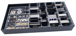 Das Insert ist exakt auf die großen Boxmaße (63,4 x 33,3 x 9,0 cm) zugeschnitten und ermöglicht es dir, deine Spielmaterialien ordentlich zu verwahren, ohne dass sich der Deckel anhebt. Sogar eine vertikale Lagerung ist möglich, wobei dies für eine derart dimensionierte Box eher selten ist. Dank spezieller Fächer für verschiedene Kartengrößen (425 große Karten, 900 Standardkarten und 450 quadratische Ausrüstungs-Karten) sind all deine Komponenten perfekt aufgehoben. Solltest du deine Ausrüstungs-Karten an anderer Stelle aufbewahren, kannst du den entsprechenden Platz für bis zu 250 weitere Standardkarten nutzen – so passt sich das System ganz deinen Bedürfnissen an.
