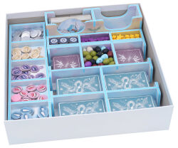Die Regeln und Spielbretter dienen als Deckel für die Fächer und sorgen so für Ordnung und Schutz. Der Einsatz ist in bis zu zwei Schichten angeordnet, mit Platz für die Bretter obenauf und einem kleinen Zusatzfach auf der dritten Schicht. Der Folded Space Insert funktioniert auch hervorragend mit dem für das Spiel erhältlichen Ressourcen-Upgrade-Pack, was dir noch mehr Flexibilität und Spielspaß bietet.