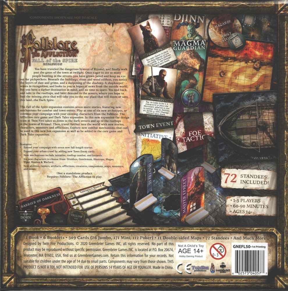 You have traveled the dangerous byways of Kremel, and finally walk past the gates of the town at twilight. Once eager to see so many people bustling in the streets, you have grown jaded and keep an eye out for pickpockets. Beneath the buildings, stone and wood edifices, you notice the layers of dust and grime, and a deepening of the shadows. A shopkeeper waves in recognition, and looks to you in hopes of news from the outside world. But you have a darker destination in mind, and no time to spare. You nod back, and take to the rooftops, and later descend to the sewers, where you hope to find the missing piece that will take you to the one place that will doom or save this land…the Dark Spire. This expansion for Folklore: The Affliction adds new Cards and Mapboards to be used with the core game. TheFall of the Spireexpansion contains six more stories, featuring new mechanisms for combat and town events. Play as one of four new archetypes, or continue your campaign with your existing characters from the Folklore: The Afflictioncore game and Dark Talesexpansion. In this new expansion the design team at Twin Fire takes us down to the dark streets and up to the rooftops in the towns of Kremel. Then, travel further into the world with new stories, characters, monsters and afflictions. Explore new combat mechanisms that can be used in this new box expansion as well as be added to the core game and Dark Tales expansion. Features: – Extend your campaign with six new full-length stories and many hours of replayable content – Expand your urban crawl by adding new Town Event cards – New mechanisms include initiative, rooftop combat, and hazards – Four new characters to choose from: the Warlord, Huntress, Gentleman, and Viper Maiden – New abilities, rumors, artifacts, afflictions, creatures, companions, maps, monsters, and items