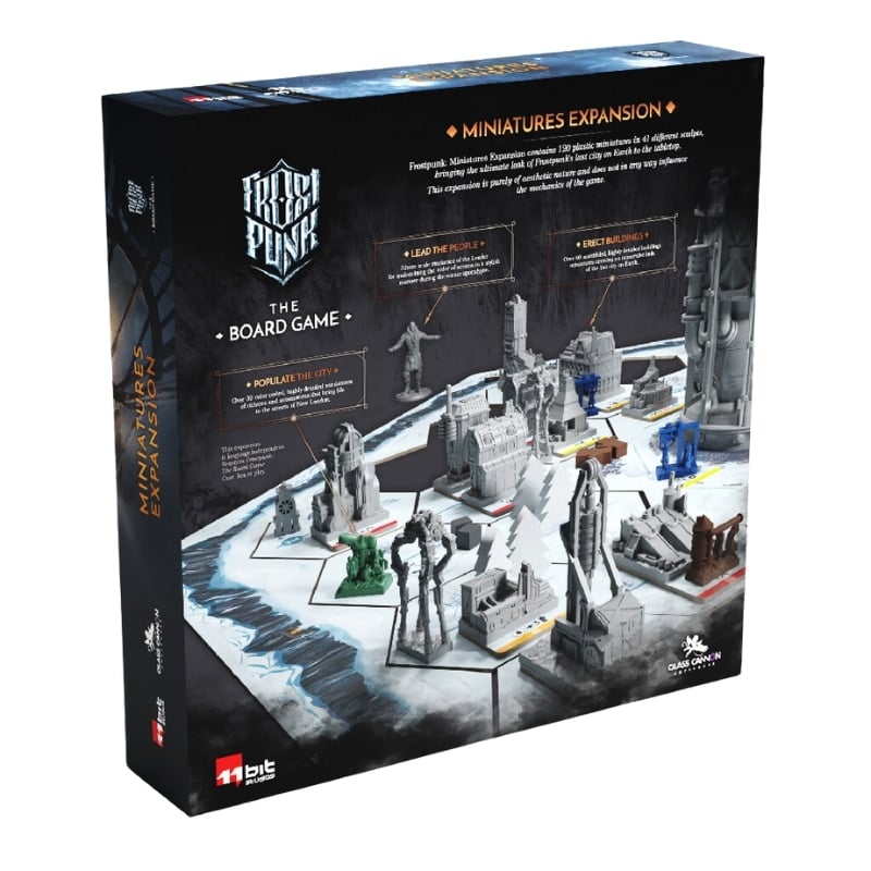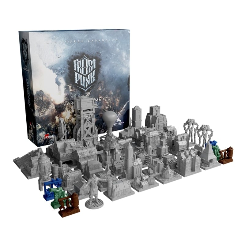 Die Miniaturen-Erweiterung enthält 120 Plastikminiaturen und bringt den ultimativen Look von Frostpunks letzter Stadt auf Erden auf Ihren Tisch. Diese Erweiterung ist rein ästhetischer Natur und hat keinen Einfluss auf die Spielmechanik.