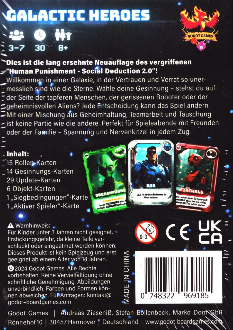 Willkommen in einer Galaxie, in der Vertrauen und Verrat so groß wie die Sterne sind. Entscheide dich für eine Seite – bist du ein tapferer Mensch, ein gerissener Roboter oder ein geheimnisvoller Alien? Jede Entscheidung, die du triffst, kann das Schicksal beeinflussen. Mit einer Mischung aus Geheimhaltung, Teamwork und Täuschung ist kein Spiel wie das andere. Galactic Heroes eignet sich perfekt für Spieleabende mit Freunden oder der Familie und verspricht Aufregung und Spannung in jeder Runde.