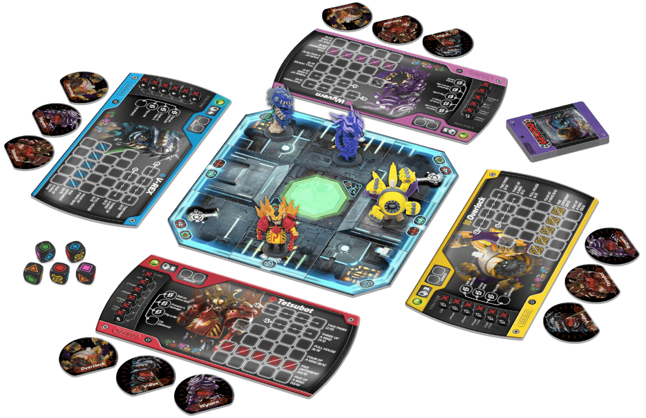 Gekidois a dice game in which each player controls a dragon, trying to beat other players by knocking their life dices from 6 points to zero. At each round, players rolls six 6 sided dice and try to score one of many combinations showed in his character sheet (pairs, three of a kind, four of a kind, etc), but watch out! If you fail on your gamble attempt you can hurt yourself instead of the enemy! As the battle gets more fierce, however, players would unlock new powers: when one of your life dices is reduced to zero, you gain new special abilities! The player who remains in play, knocking all opponent’s life dices, wins the game.