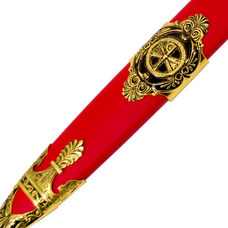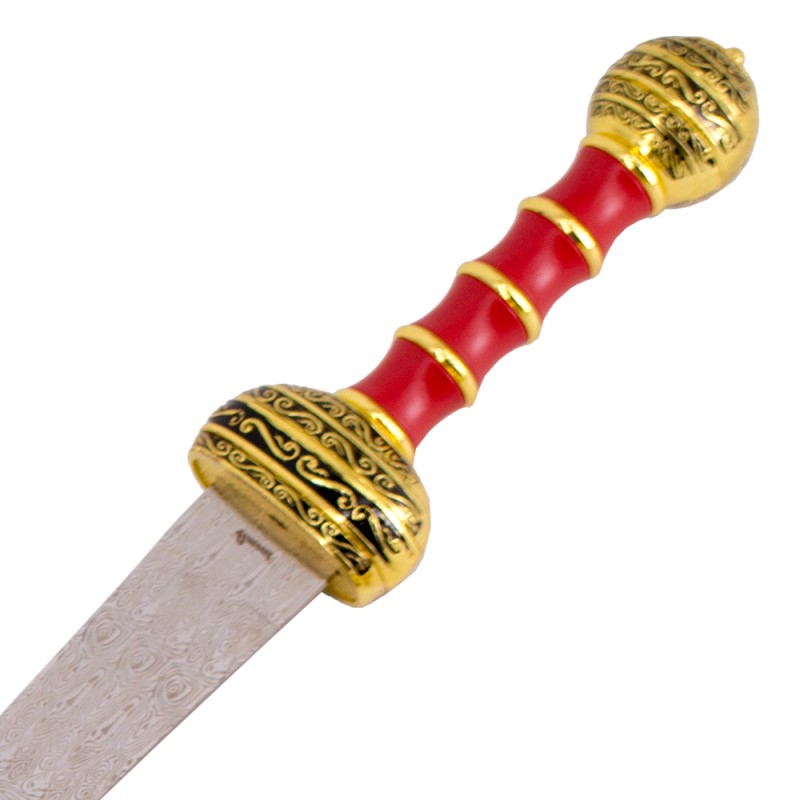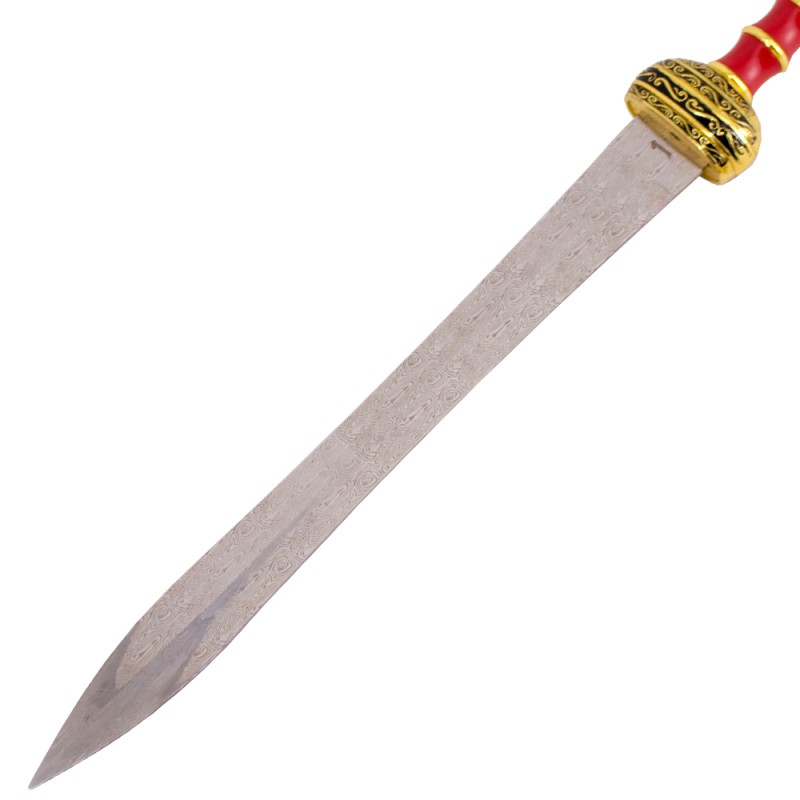 Gladius Maximus Schwert Rot in Damast Optik ein aufwendig verziertes Gladius vom Typ Mainz. Griff und Scheide im roten Holz-Design. Klinge in Damast Optik gestaltet